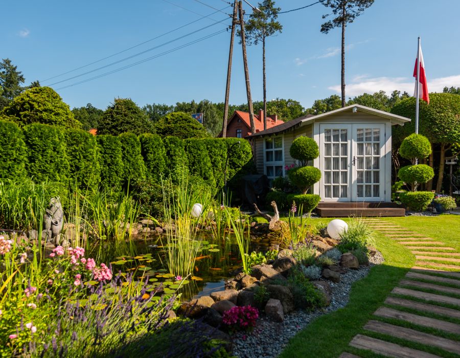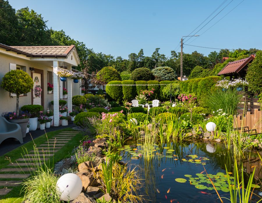 urzekający ogród z dużym oczkiem wodnym i rybami. Można znaleźć tutaj wiele