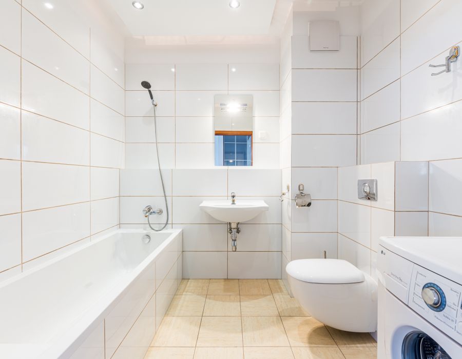 - łazienka z wanną, pralką LG oraz umywalką z lustrem.