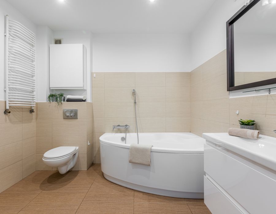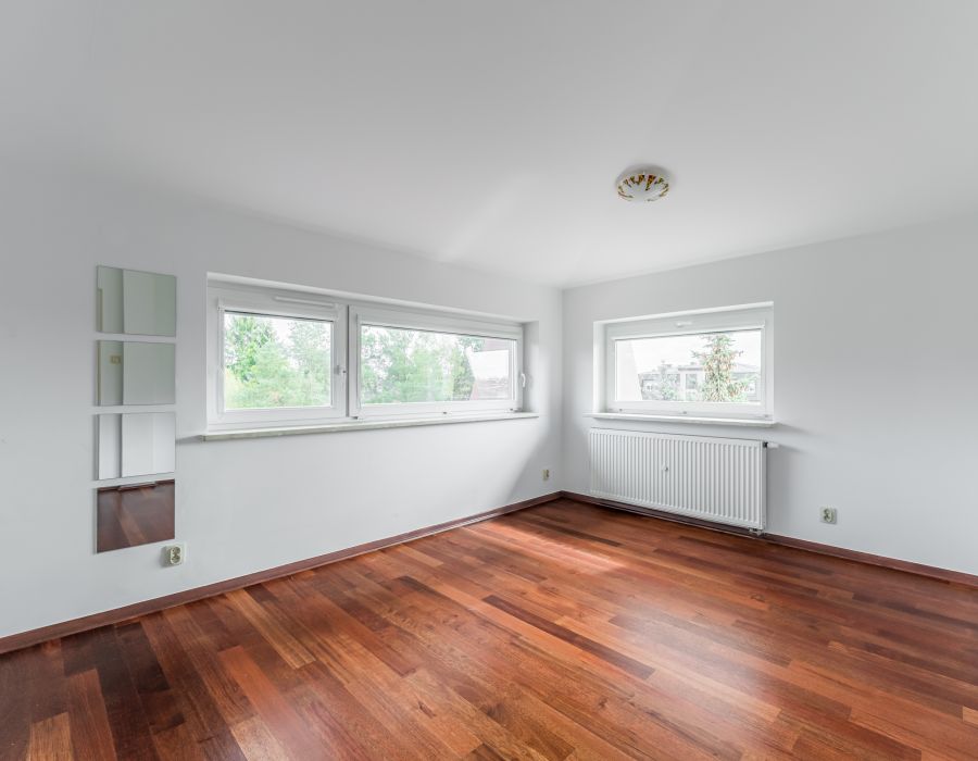 Podłogi wykończono parkietem z drewna egzotycznego, a łazienka została wyposażona w wannę i osobny prysznic.